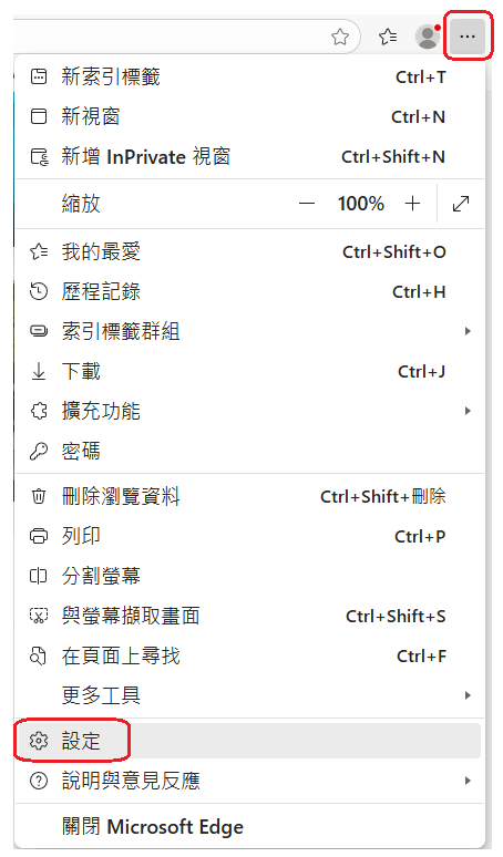 瀏覽器介面中右上角點選 "設定及其它" 按鈕,選擇 【設定】選項。