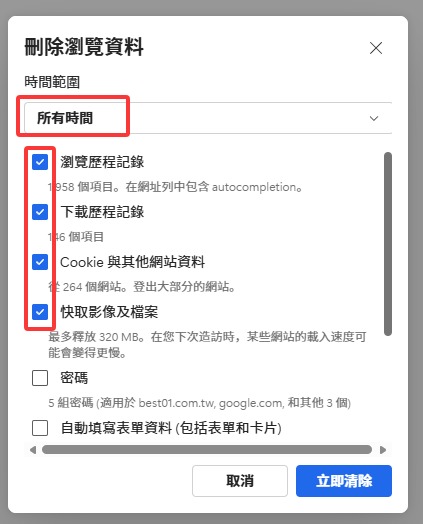 從彈出的視窗中改為 "所有時間",可勾選下圖所示的4個項目,再點選【立即清除】即可。