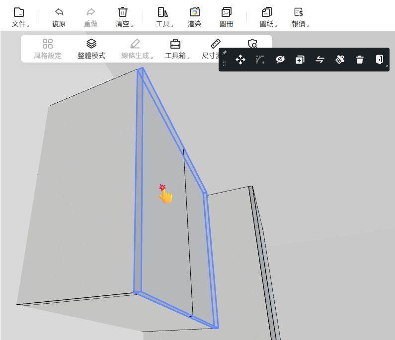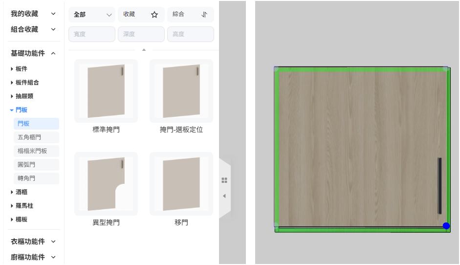 | ②左鍵點選任一藍色圓點,可拖曳門板的範圍大小(範圍以層板、頂/底板、左/右板為準,點左 | |