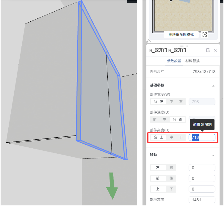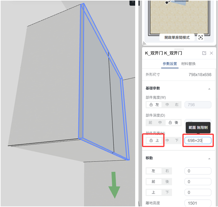 | ④生成完之後再次點選一次門板,右側的參數設置,鎖定在【上】的位置,數值欄位中可直接輸 | |