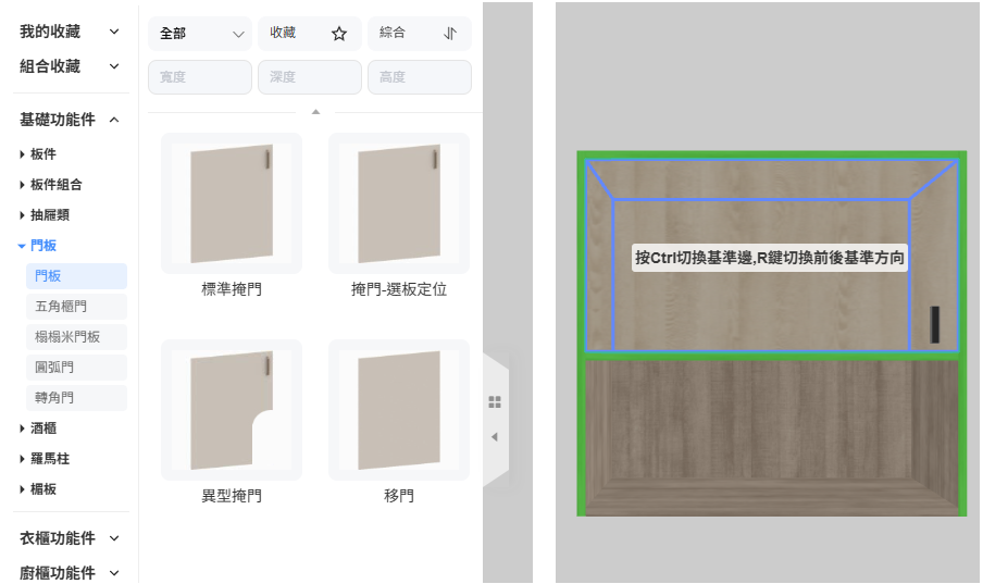 | ①從元件模式底下加入標準掩門,移動到櫃體內點選左鍵。 | |
