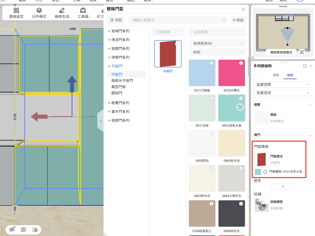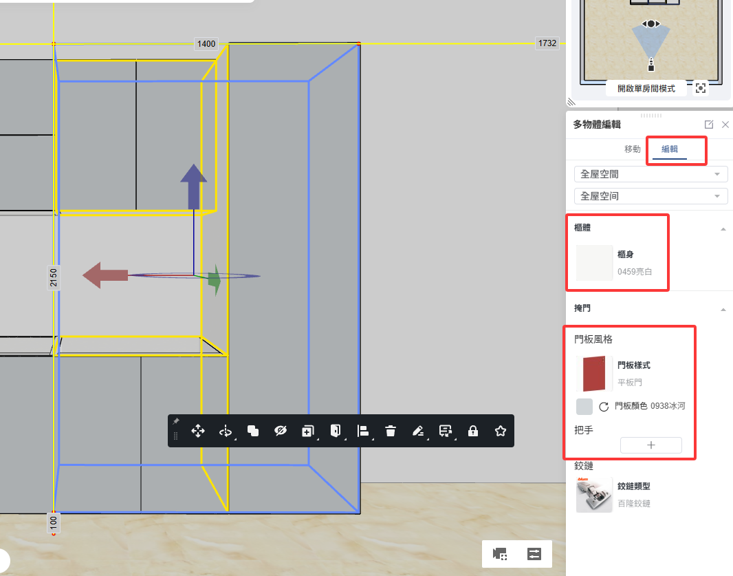 ②右邊的多物體編輯的參數中,可進行修改門板、櫃身等等參數。