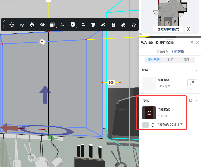 ①從材「材料替換」功能選擇「櫃身門板」,修改門板樣式。