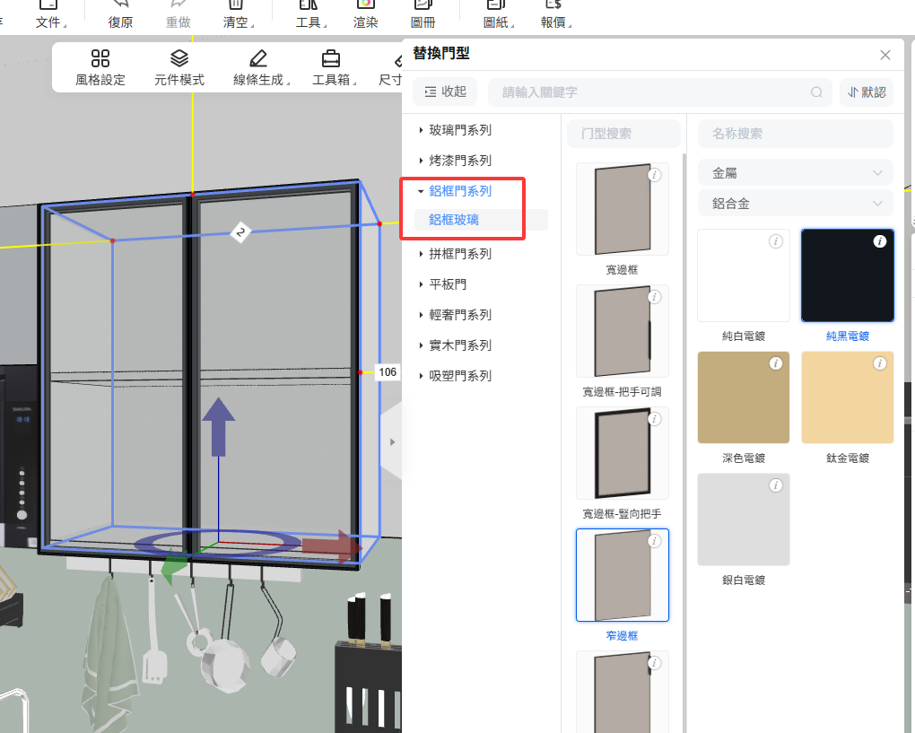 ②樣式選擇鋁框門系列,鋁框玻璃-窄邊框造型即可。