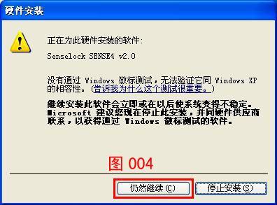 d)另外,在WinXP系統下安裝軟體鎖驅動時,有時會出現一個如圖004所示的對話方塊,只要選擇 "仍然繼續" 就可以了。 |
