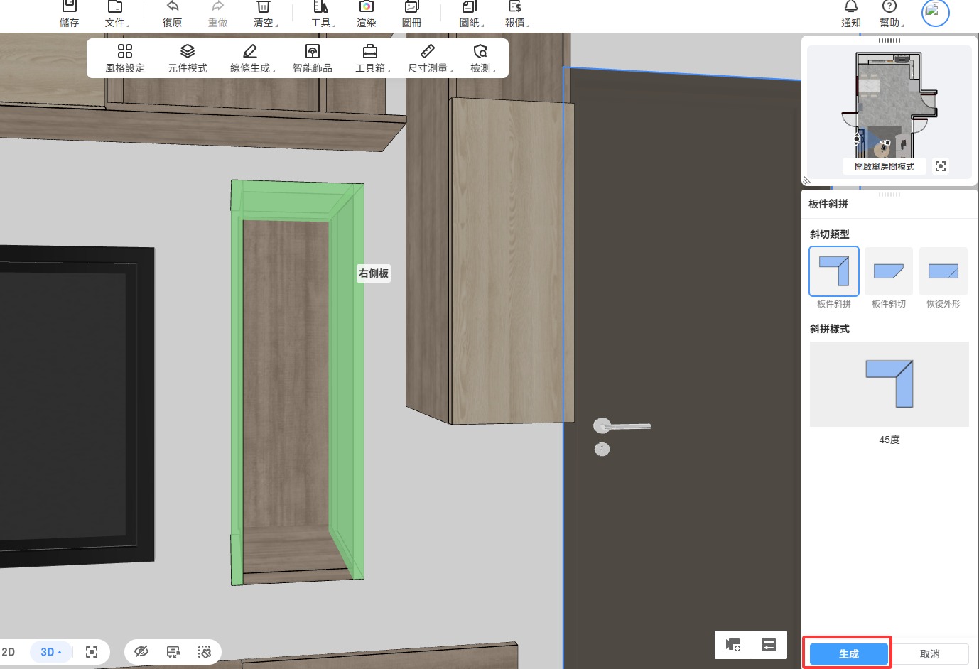 | ✨ 擇廚在進入板件斜拼功能下,從右側的斜切類型中選到【板件斜切】選項,依照系統提示,將滑鼠游 | |