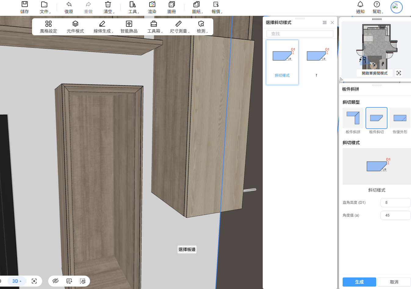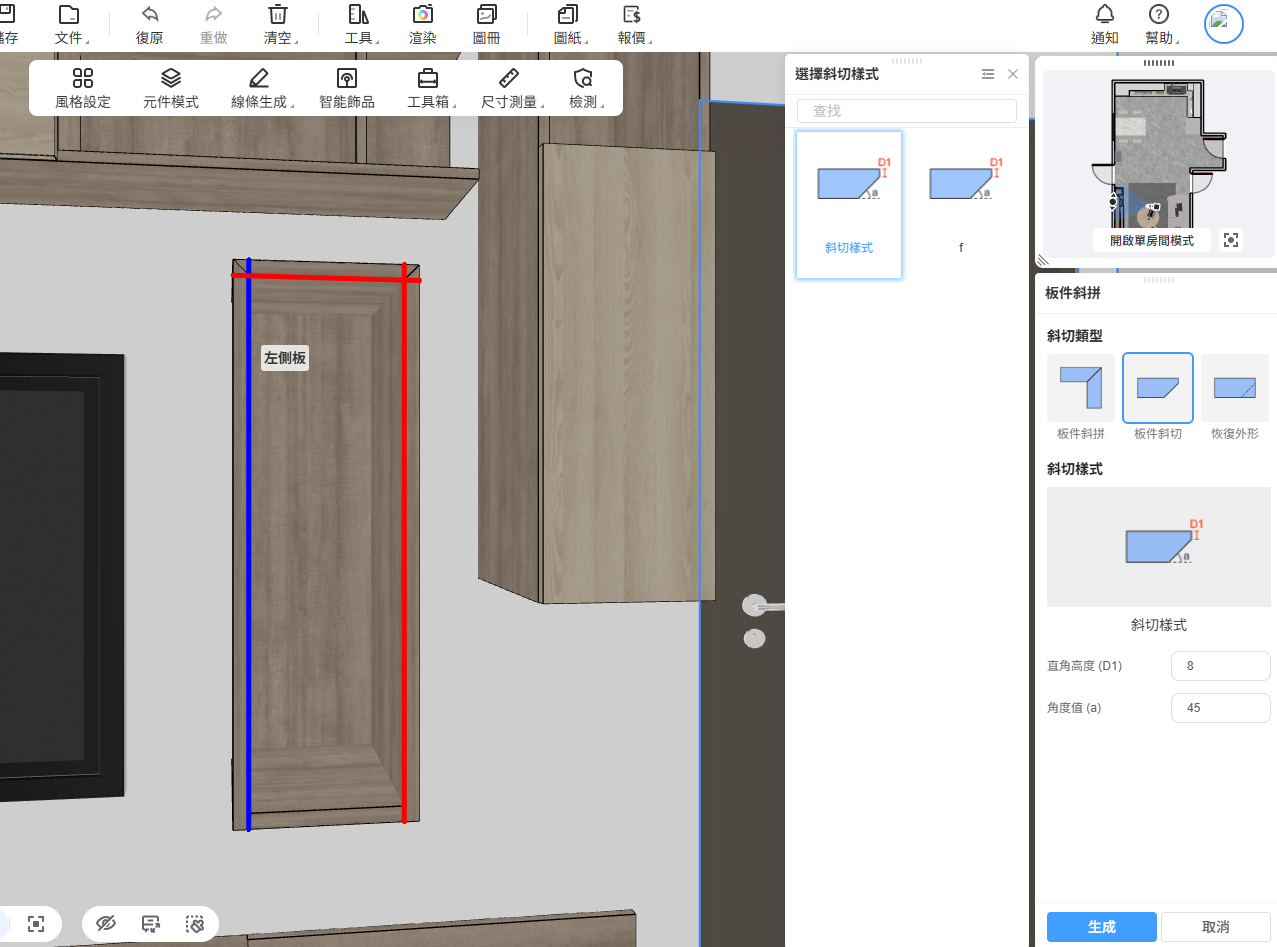 | ✨ 此外,這項功能也適用於單塊板件的邊緣斜面倒角處理,滿足特定造型或拼接需求,進一步提升設計 | |